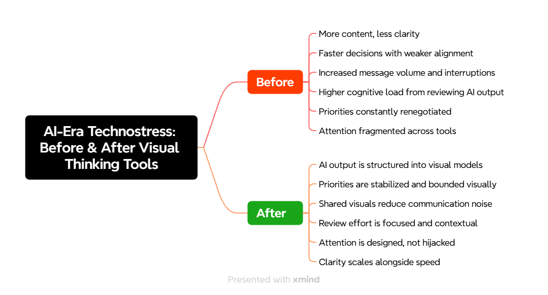 Here are the main ways visual thinking tools reduce AI-generated technostress: