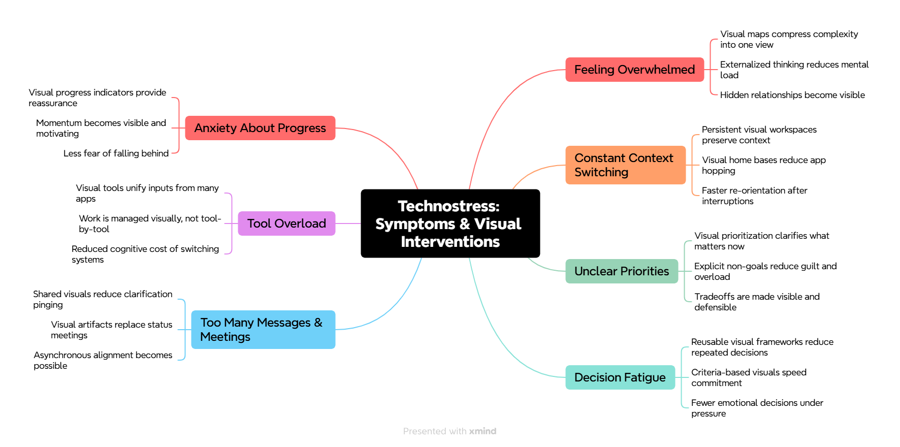 - They restore a sense of control through structure: A major driver of technostress is feeling that work is coming at you (messages, tasks, alerts) rather than being owned by you. Visual tools impose structure: categories, relationships, priorities, dependencies.